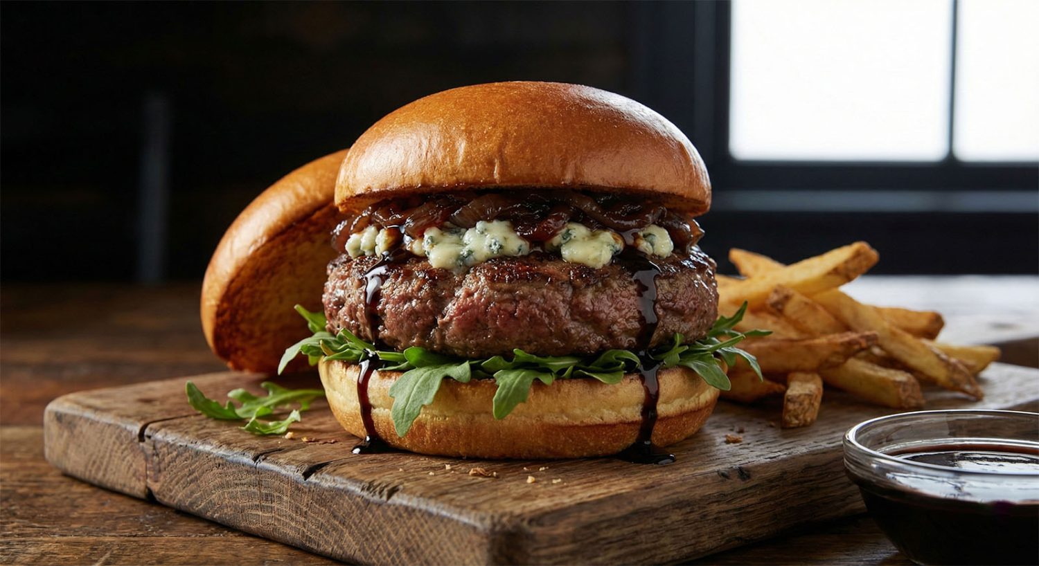🧀 2. Angus Бургер с карамелизиран лук и синьо сирене (гурме вариант)